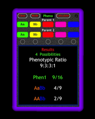 Punnett Calc calculates all the possible genotypes and phenotypes that can be produced from two given parent genotypes. Punnett Calc also calculates the probability of producing individual genotypes, phenotypes, and respective ratios (absence of gene linkage assumed).